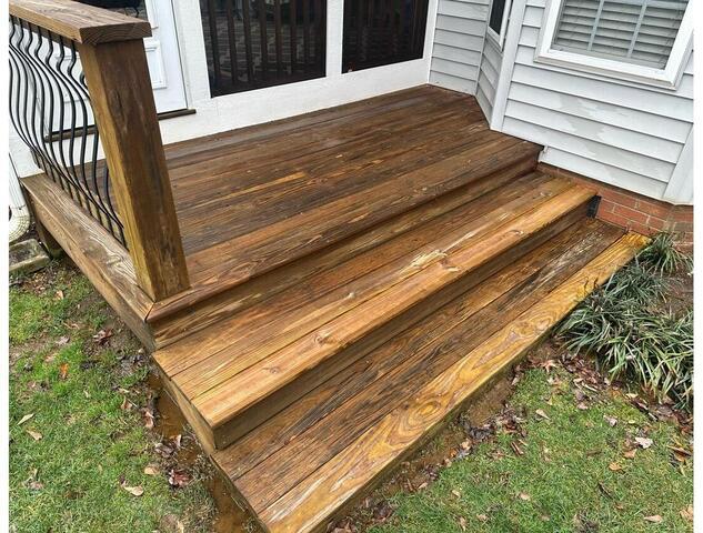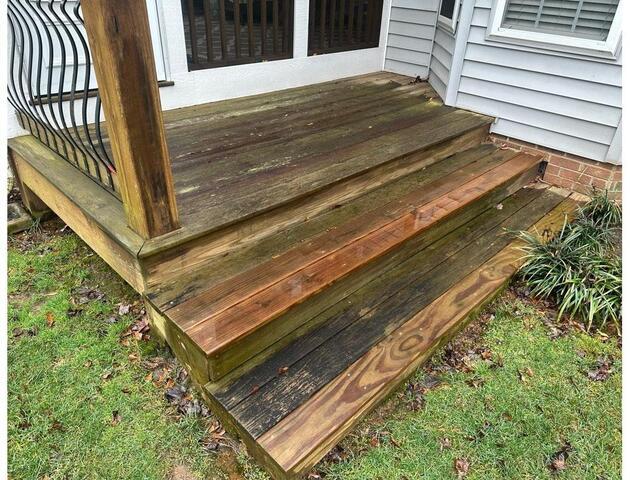 This small back deck was a hazard to walk on with a slick surface. The homeowners requested our help to soft wash their home. Look at the difference! The dark grime was washed away, restoring the original color of the wood.